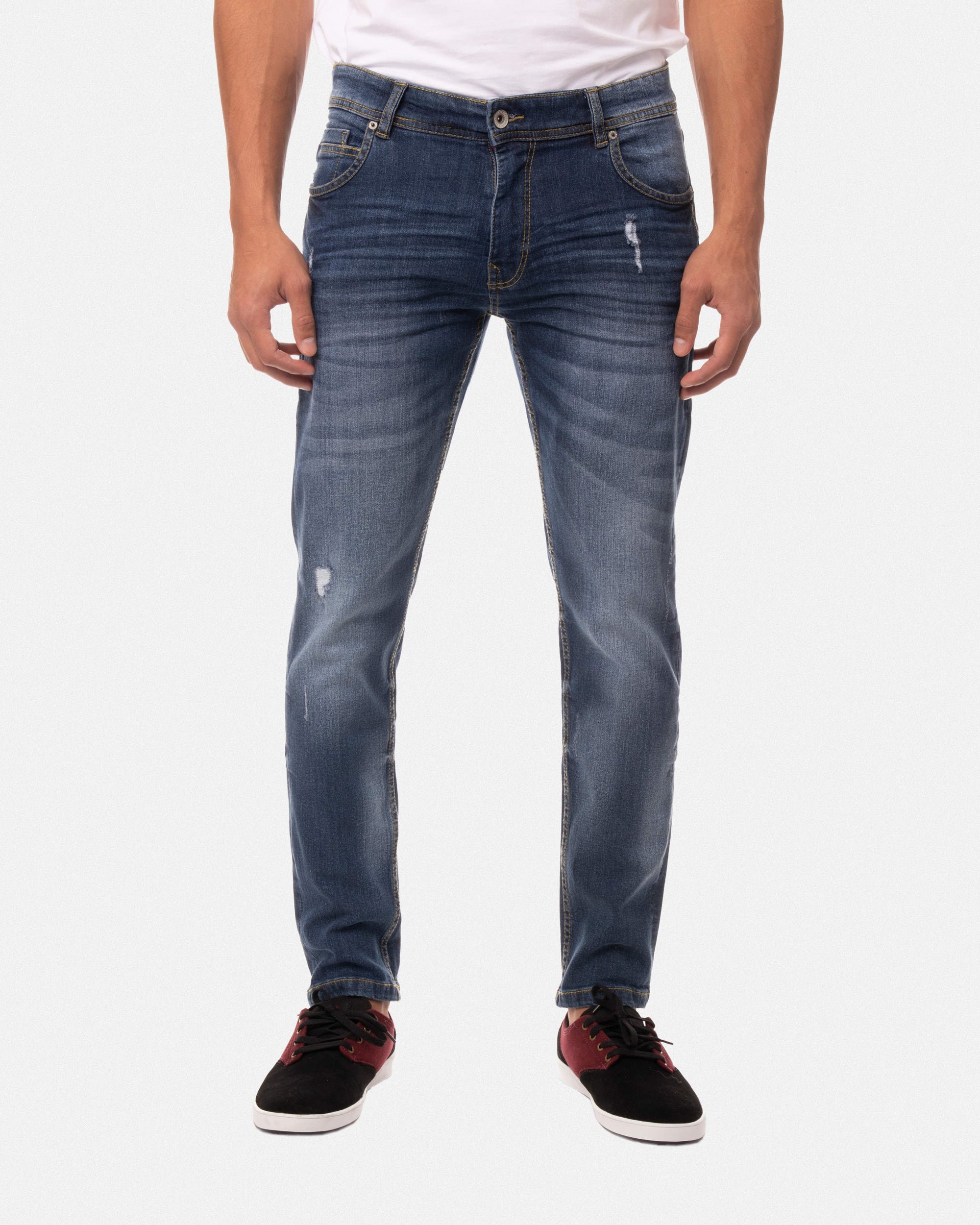 - FIT : Skinny slim fit straight leg tapered and tailored through hip and thigh with stretch material to give a stylish look. No pulling when a bit tight. Rests just below the waist.